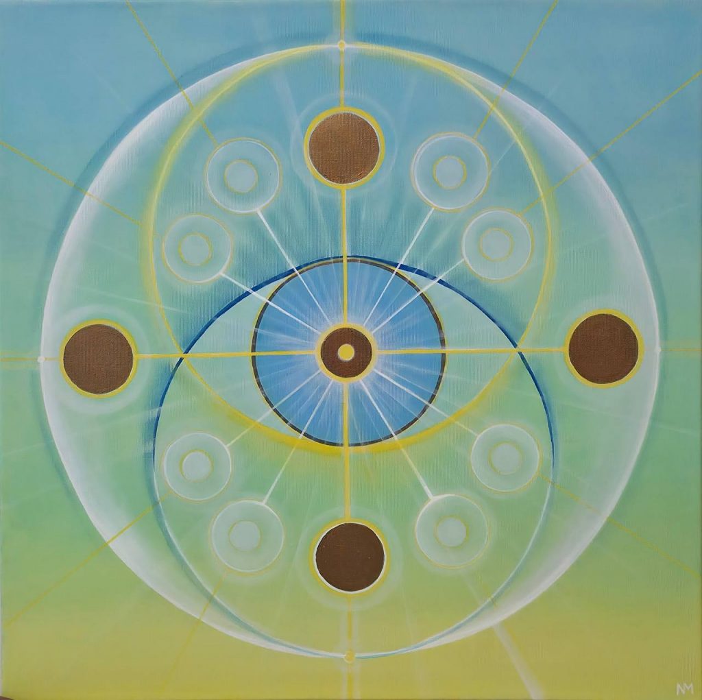 «Union» is a visual atmology of space, where the sky meets the earth, and the solar energy of action softly intertwines with lunar intuition. At the center of the canvas lies the «assembly point»—the very all-seeing eye of harmony through which we look at the world, and the world looks back at us.